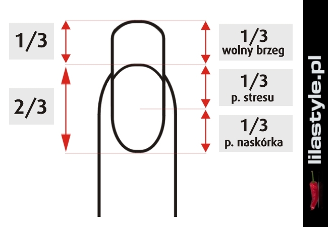 Warto w tym temacie wspomnieć o proporcji, czyli podstawowej zasadzie, która określa długość łoża paznokcia, które stanowi 2/3 w stosunku do całego paznokcia, resztę czyli 1/3 zajmuje wolny brzeg. Dokładniejszy podział wyznacza trzy części: 1/3 wolny brzeg, 1/3 pole stresu, 1/3 strefa naskórka. Proporcje należy zachować na każdym z paznokci. Strefy powinny zaczynać się i kończyć w punktach umieszczonych na tych samych wysokościach. Ich rozłożenie powinno stanowić odbicie lustrzane względem osi symetrii paznokcia.
