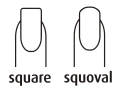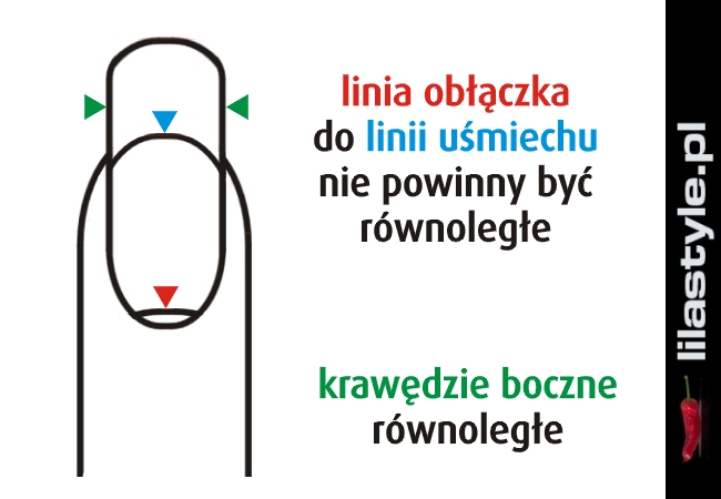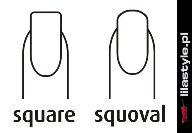 modelki, jednak musi być taki sam na wszystkich palcach. Uformowane krawędzie boczne wolnego brzegu paznokcia muszą być przedłużeniem naturalnej płytki paznokcia. Nie mogą być węższe lub szersze i muszą przebiegać na tej samej wysokości tworząc od frontu równomierny tunel o tej samej grubości. Linie te powinny być przede wszystkim równoległe względem siebie i posiadać tą samą długość. Spełniając podane kryteria, stylistkom pozostają do wyboru dwa kształty. Są nimi square (łopatka) i squoval, zwany szpadlem. Pierwszy charakteryzuje się krawędzią czołową usytuowaną prostopadle do krawędzi bocznych, natomiast drugi posiada widoczne zaokrąglenie końcówki paznokcia.